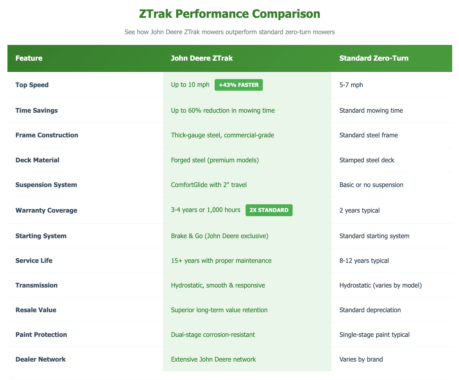 When it comes to getting the job done quickly and efficiently, time matters. The ZTrak™ lineup ensures your time isn't wasted, with the most powerful models reaching speeds of up to 10 mph — a step up from most standard zero-turns operating at 5-7 mph. This can reduce your mowing time by up to 60% while still producing quality cuts that will make your lawn the talk of the neighborhood.
